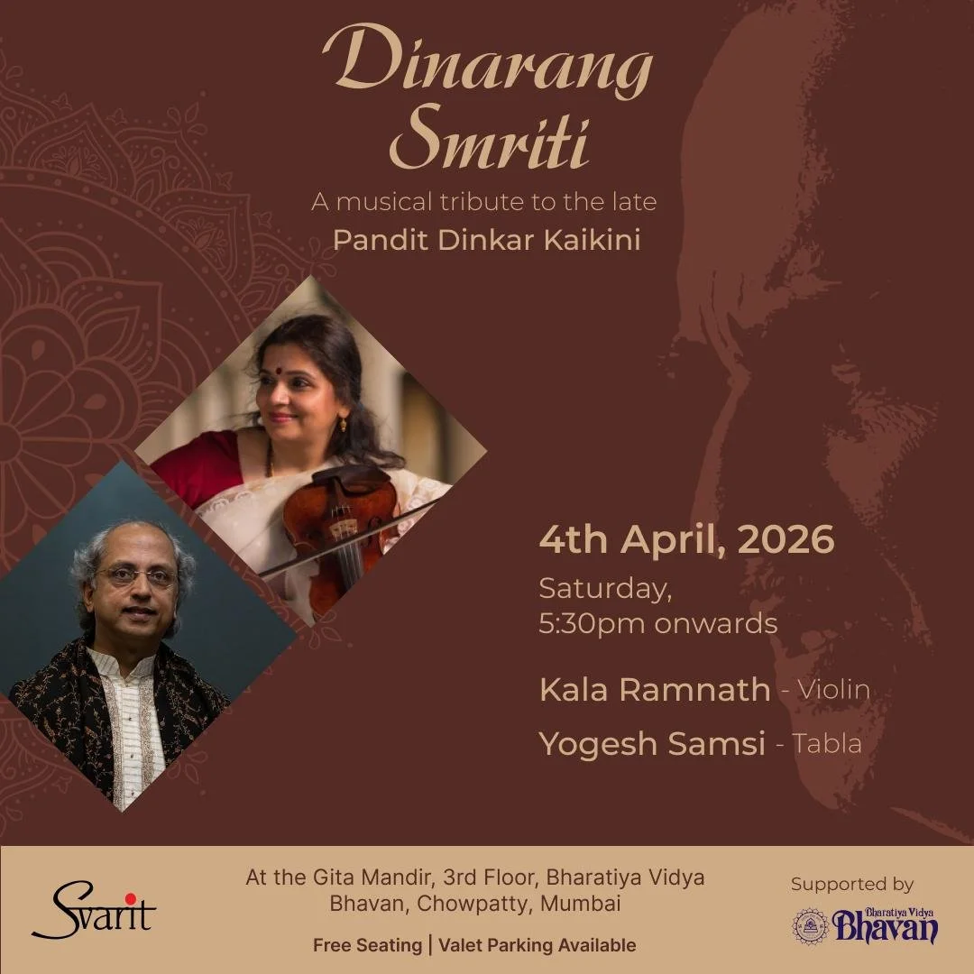 Concert at the Dinarang Smriti Festival at Bharatiya Vidya Bhavan Mumbai Saturday, April 4, 2026 5:30 PM 7:30 PM Bharatiya Vidya Bhavan 29 KM Munshi Road Mumbai, MH, 400007 India (map) Google Calendar ICS