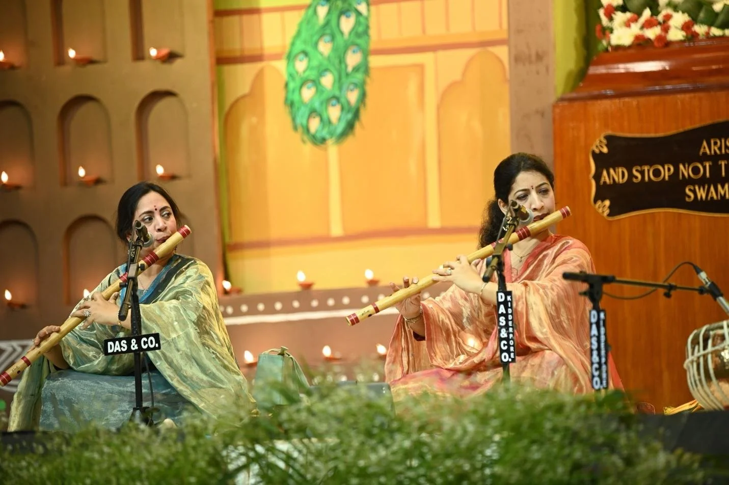 This year, duets threaded through all three sessions of the day. Among them were two blessed duos who stepped into this male bastion for the first time: Hindustani classical music’s only flute sisters, Suchismita and Debopriya Chatterjee, and the violin wizard Kala Ramnath with Saraswati veena virtuoso Jayanti Kumaresh.